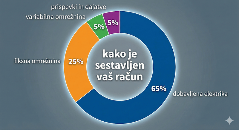 - Primerjanje samo po kWh: To je pogosta napaka. Če je razlika v kWh majhna, jo lahko “pojejo” fiksni stroški ali pogoji paketa. Dejanska cena elektrike je namreč vedno seštevek vseh postavk.